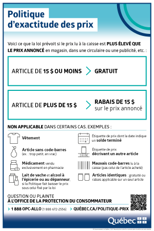 La Politique d’exactitude des prix prévoit un dédommagement si le prix lu à la caisse est plus élevé que le prix annoncé (en magasin, dans une publicité, dans une circulaire, etc.). Le commerçant doit :